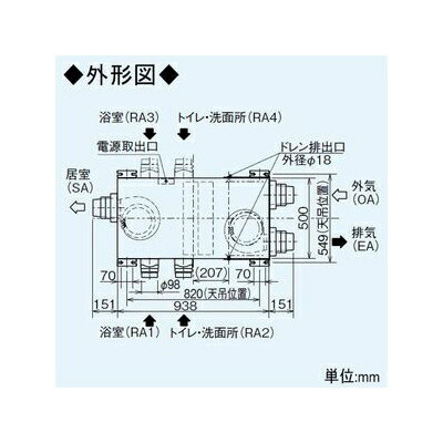 【仕様】●浴室暖房機連動シリーズ●寒冷地タイプ●透湿膜製全熱交換器●本体耐湿仕様●居室・浴室・トイレ・洗面所用●接続パイプ(mm):OA・EA・RA/φ100、SA/φ100(φ50)●ドレンパン付●RAダクト接続口は2方向(左右)選択可能●浴室からのRA接続可能●外気清浄フィルター内蔵(粒径10μm以上の質量法捕集率約82%)●速結端子接続●給気を強ノッチまたは弱ノッチに固定する運転モードも選択可能●EA(排気)ダクト接続口は、逆流防止シャッターを受注対応可能●外気温センサー感知による自動間欠運転機能●付属品:天吊金具、ドレンホース、ホースバンド、ドレンキャップ《特性/電源電圧100V》●消費電力(W)・急速(RAバイパス)運転(50Hz):3/87.5、2/75、1/66.5・24時間(RA熱交換)運転(50Hz):8/63.5、7/60.5、6/57.5、5/33.5、4/30、3/29、2/28、1/27・急速(RAバイパス)運転(60Hz):3/100、2/87.5、1/78.5・24時間(RA熱交換)運転(60Hz):8/75.5、7/73、6/69.5、5/34.5、4/32、3/30、2/29、1/27.5●排気風量(㎥/h)・急速(RAバイパス)運転:3/200(150Pa)、2/180(121Pa)、1/160(96Pa)・24時間(RA熱交換)運転:8/150(80Pa)、7/140(73Pa)、6/130(63Pa)、5/120(54Pa)、4/110(45Pa)、3/100(37.5Pa)、2/90(30.5Pa)、1/80(24Pa)●排気風量-浴室(㎥/h)・急速(RAバイパス)運転:3/100、2/90、1/80・24時間(RA熱交換)運転:8/50、7/47、6/43、5/40、4/37、3/33、2/30、1/27●排気風量-トイレ、洗面所(㎥/h)・急速(RAバイパス)運転:3/100、2/90、1/80・24時間(RA熱交換)運転:8/100、7/93、6/87、5/80、4/73、3/67、2/60、1/53●定格給気風量(㎥/h)・急速(RAバイパス)運転(50Hz):3/強-150(80Pa)、2/強-150(80Pa)、1/強-150(80Pa)・24時間(RA熱交換)運転:8/強-150(80Pa)、7/強-150(80Pa)、6/強-150(80Pa)、5/弱-96(34.5Pa)、4/弱-96(34.5Pa)、3/弱-96(34.5Pa)、2/弱-96(34.5Pa)、1/弱-96(34.5Pa)・急速(RAバイパス)運転(60Hz):3/強-170(102Pa)、2/強-170(102Pa)、1/強-170(102Pa)・24時間(RA熱交換)運転:8/強-170(102Pa)、7/強-170(102Pa)、6/強-170(102Pa)、5/弱-84(25Pa)、4/弱-84(25Pa)、3/弱-84(25Pa)、2/弱-84(25Pa)、1/弱-84(25Pa)●有効換気量率(%):95●交換効率-温度(%)・急速(RAバイパス)運転:3/-、2/-、1/-・24時間(RA熱交換)運転:8/60、7/59、6/58、5/70、4/69、3/68、2/67、1/66●交換効率-エンタルピー暖房時(%)・急速(RAバイパス)運転:3/-、2/-、1/-・24時間(RA熱交換)運転:8/46、7/45、6/44、5/57、4/56、3/55、2/54、1/53●交換効率-エンタルピー冷房時(%)・急速(RAバイパス)運転:3/-、2/-、1/-・24時間(RA熱交換)運転:8/41、7/40、6/39、5/50、4/49、3/48、2/47、1/46●騒音(dB)・急速(RAバイパス)運転:3/39、2/36、1/33・24時間(RA熱交換)運転:8/32、7/31.5、6/31、5/30、4/29、3/27、2/25、1/24●定風量域最大静圧(Pa)・急速(RAバイパス)運転:3/150、2/170、1/180・24時間(RA熱交換)運転:8/180、7/190、6/190、5/200、4/200、3/200、2/200、1/200●質量(kg):22【仕様】●浴室暖房機連動シリーズ●寒冷地タイプ●透湿膜製全熱交換器●本体耐湿仕様●居室・浴室・トイレ・洗面所用●接続パイプ(mm):OA・EA・RA/φ100、SA/φ100(φ50)●ドレンパン付●RAダクト接続口は2方向(左右)選択可能●浴室からのRA接続可能●外気清浄フィルター内蔵(粒径10μm以上の質量法捕集率約82%)●速結端子接続●給気を強ノッチまたは弱ノッチに固定する運転モードも選択可能●EA(排気)ダクト接続口は、逆流防止シャッターを受注対応可能●外気温センサー感知による自動間欠運転機能●付属品:天吊金具、ドレンホース、ホースバンド、ドレンキャップ《特性/電源電圧100V》●消費電力(W)・急速(RAバイパス)運転(50Hz):3/87.5、2/75、1/66.5・24時間(RA熱交換)運転(50Hz):8/63.5、7/60.5、6/57.5、5/33.5、4/30、3/29、2/28、1/27・急速(RAバイパス)運転(60Hz):3/100、2/87.5、1/78.5・24時間(RA熱交換)運転(60Hz):8/75.5、7/73、6/69.5、5/34.5、4/32、3/30、2/29、1/27.5●排気風量(㎥/h)・急速(RAバイパス)運転:3/200(150Pa)、2/180(121Pa)、1/160(96Pa)・24時間(RA熱交換)運転:8/150(80Pa)、7/140(73Pa)、6/130(63Pa)、5/120(54Pa)、4/110(45Pa)、3/100(37.5Pa)、2/90(30.5Pa)、1/80(24Pa)●排気風量-浴室(㎥/h)・急速(RAバイパス)運転:3/100、2/90、1/80・24時間(RA熱交換)運転:8/50、7/47、6/43、5/40、4/37、3/33、2/30、1/27●排気風量-トイレ、洗面所(㎥/h)・急速(RAバイパス)運転:3/100、2/90、1/80・24時間(RA熱交換)運転:8/100、7/93、6/87、5/80、4/73、3/67、2/60、1/53●定格給気風量(㎥/h)・急速(RAバイパス)運転(50Hz):3/強-150(80Pa)、2/強-150(80Pa)、1/強-150(80Pa)・24時間(RA熱交換)運転:8/強-150(80Pa)、7/強-150(80Pa)、6/強-150(80Pa)、5/弱-96(34.5Pa)、4/弱-96(34.5Pa)、3/弱-96(34.5Pa)、2/弱-96(34.5Pa)、1/弱-96(34.5Pa)・急速(RAバイパス)運転(60Hz):3/強-170(102Pa)、2/強-170(102Pa)、1/強-170(102Pa)・24時間(RA熱交換)運転:8/強-170(102Pa)、7/強-170(102Pa)、6/強-170(102Pa)、5/弱-84(25Pa)、4/弱-84(25Pa)、3/弱-84(25Pa)、2/弱-84(25Pa)、1/弱-84(25Pa)●有効換気量率(%):95●交換効率-温度(%)・急速(RAバイパス)運転:3/-、2/-、1/-・24時間(RA熱交換)運転:8/60、7/59、6/58、5/70、4/69、3/68、2/67、1/66●交換効率-エンタルピー暖房時(%)・急速(RAバイパス)運転:3/-、2/-、1/-・24時間(RA熱交換)運転:8/46、7/45、6/44、5/57、4/56、3/55、2/54、1/53●交換効率-エンタルピー冷房時(%)・急速(RAバイパス)運転:3/-、2/-、1/-・24時間(RA熱交換)運転:8/41、7/40、6/39、5/50、4/49、3/48、2/47、1/46●騒音(dB)・急速(RAバイパス)運転:3/39、2/36、1/