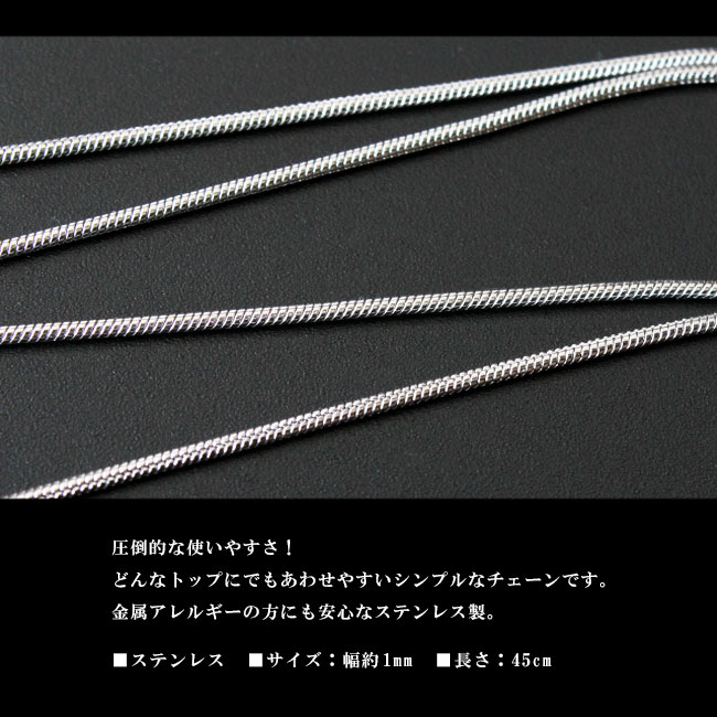 □ 商品詳細 □ 【素材】 ■ステンレス 【仕様】 ■幅:1mm ■長さ:約40、45、50cm ステンレス製のシンプルでエレガントなスネークチェーンです。